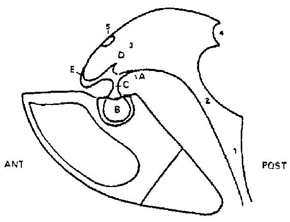 – – Les petites ailes se prolongent en dedans par les apophyses clinoïdes antérieures. En arrière on a la gouttière optique qui continue de chaque coté par les trous optiques. La selle turcique se trouve en arrière des gouttières optiques. Elle est limitée en avant par le tubercule de la selle et en arrière par le départ de la lame quadrilatère ou clivus